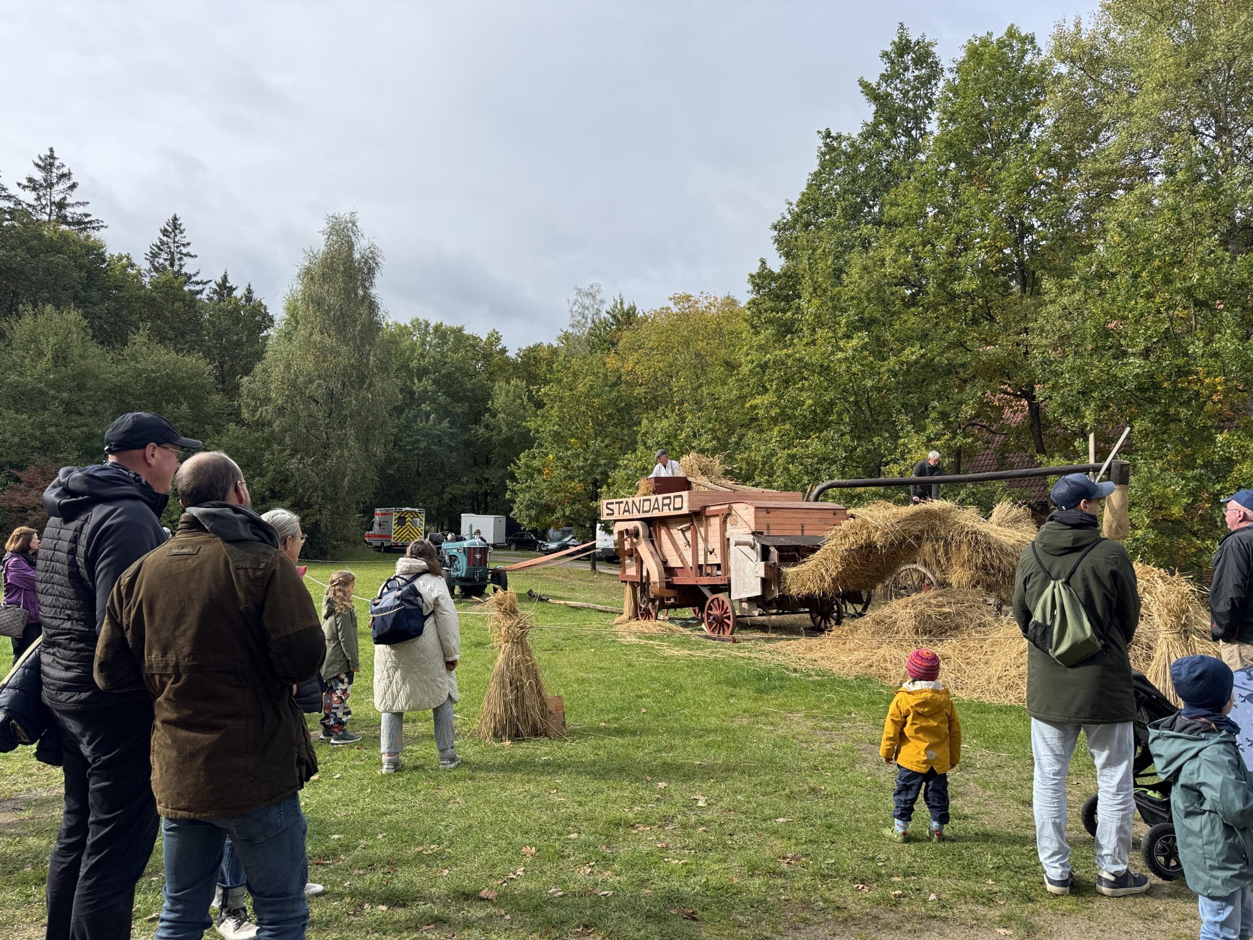Ratternd schluckt die große Dreschmaschine die langen Getreidehalme, lässt sie durch ihre mechanischen Eingeweide wandern und wirft das gedroschene Stroh auf einem wachsenden Haufen wieder aus. Auch an diesem Erntedank-Sonntag begrüßt die mächtige Anlage die Besuchenden direkt nach dem Eintreten. Angetrieben von einem alten Hanomag-Trecker gibt sie einen Einblick in die Zeit der Mechanisierung der Landwirtschaft in den 1950er Jahren des vorigen Jahrhunderts.