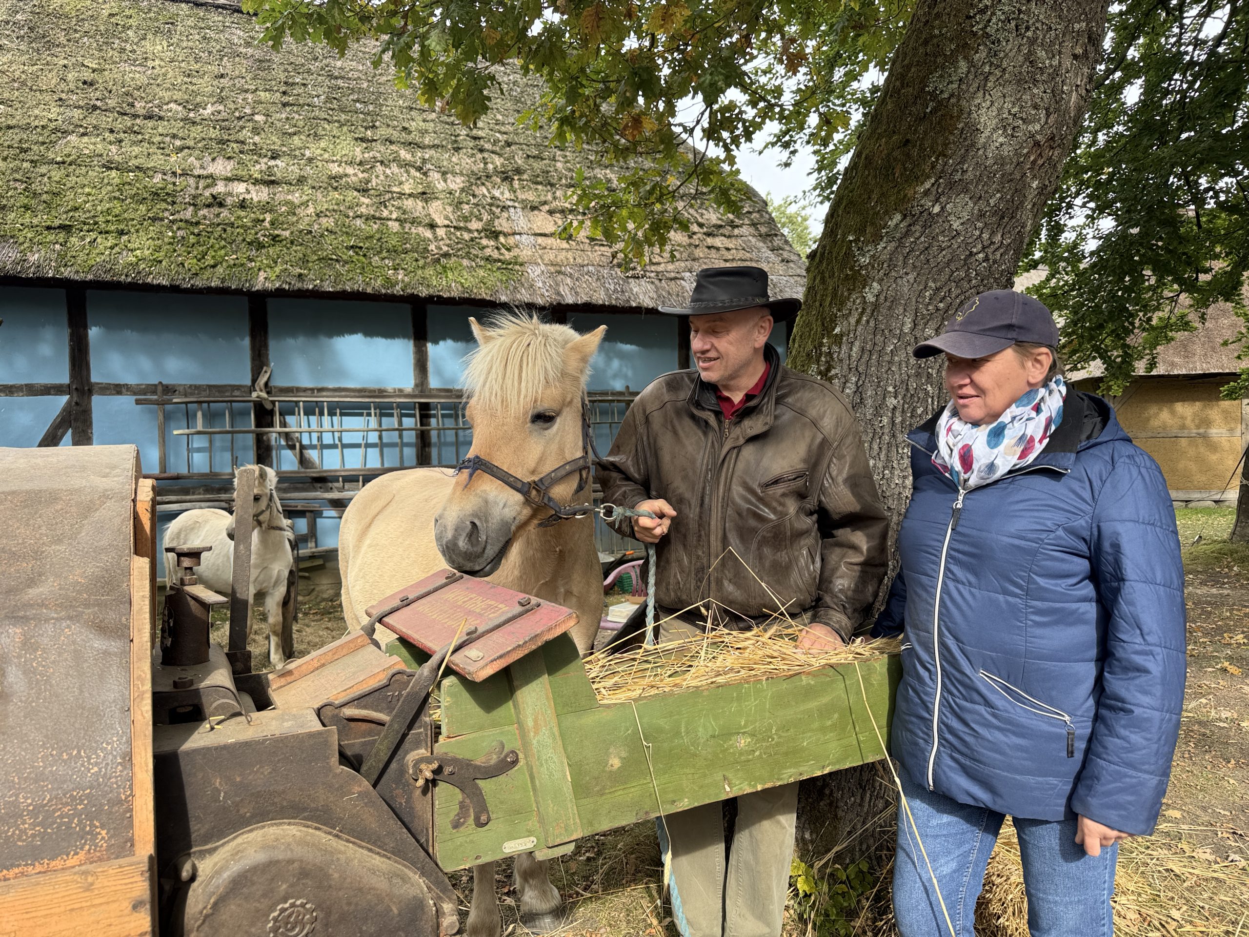 Ein paar Schritte weiter zieht Norwegerstute Fricka unter dem Göpeldach ihre Runden. Sie treibt eine alte Häckselmaschine an und Sabine Kassebaum erklärt gerne die Zusammenhänge. „Es ist so viel Wissen verloren gegangen“, erzählt sie. „Alle warten, dass die KI ihnen etwas erklärt. Hier aber können wir selbst sehen und erleben, wie Lebensmittel hergestellt werden.“