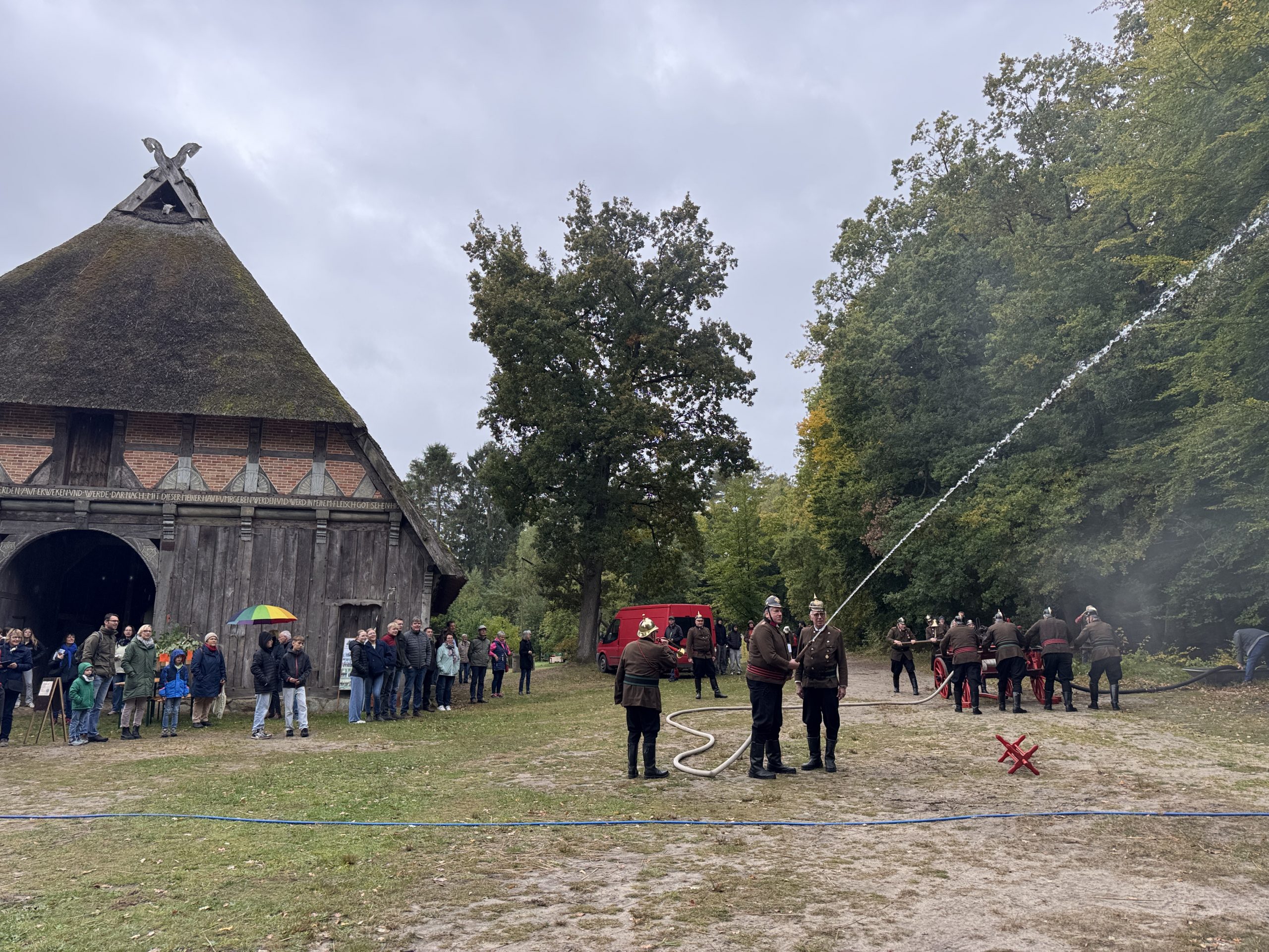 Kaum ein Stück Torte im Bauch, wurden die Museumsgäste in Unruhe versetzt: Feuer am Brümmerhof! Nur gut, dass die Pumpengruppe Rosche-Prielip mit ihrer Spritze vor Ort war. Das Gerät von 1886 tat vorbildlich Dienst und der Brand konnte glücklicherweise rasch gelöscht werden. Hauptmann Jürgen Kaschube mit seiner Truppe bewahrte das Museumsdorf nicht zum ersten Mal vor größerem Schaden, was auch Sigrid und Horst Kruger mit Sohn Jan freute. Die Drei fühlen sich dem Museumsdorf ein Leben lang verbunden, zumal sie selbst Museumsleute sind: Sie betreuen das Schulmuseum in Seedorf.